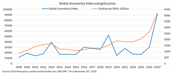 Gold’s strong performance in 2025 underscores how well the metal thrives in periods of uncertainty, and such conditions continue into 2026. As a result, gold remains a relevant hedge, offering protection against geopolitical risk, currency debasement, and financial stress. However, investors should be mindful that a sharp de-escalation in major conflicts or faster-than-expected disinflation could trigger a near-term pullback in gold prices. Also the sharp run up means that there are risks of sharp corrections at certain points.